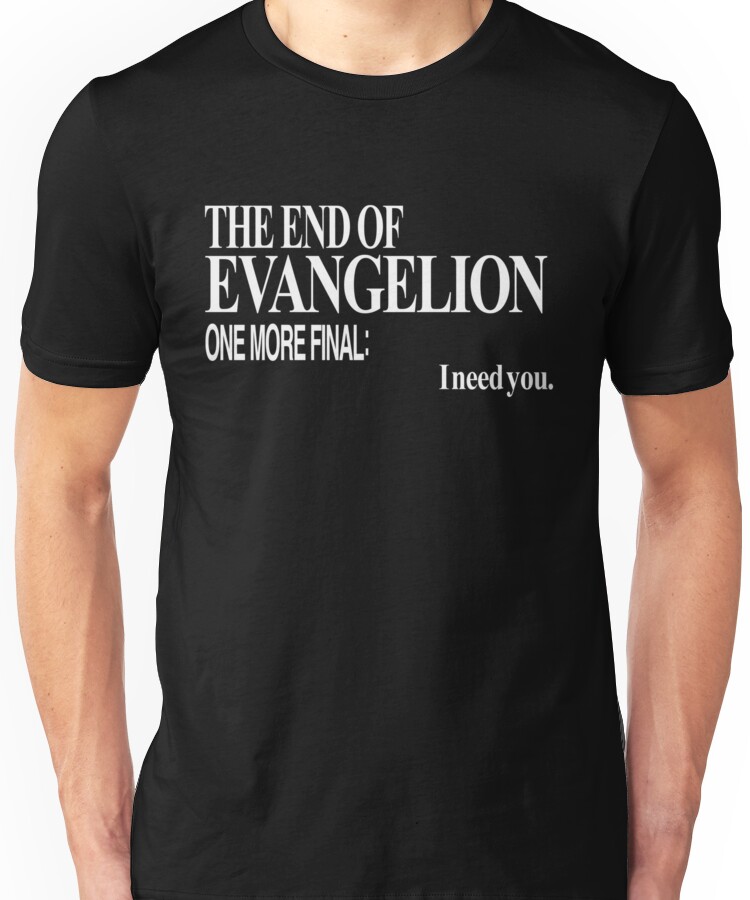from the Artist: Unisex T-Shirt. Title card from ep 26′ End of Evangelion – I need you I know there is already a design like this but its just a screenshot from the show and doesn’t look as nice