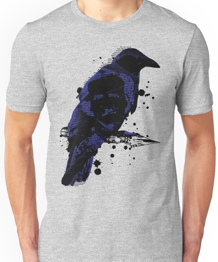 from the Artist: Unisex T-Shirt. A homage to Poe and because Danny always has his finger on the pulse. !http://farm5.static.flickr.com/4022/4308592446_8a11526fb2_b.jpg! A refresher: The Raven by Edgar Allan Poe First published in 1845 Once upon a midnight dreary, while I pondered weak and weary, Over many a quaint and curious volume of forgotten lore, While I nodded, nearly napping, suddenly there came a tapping, As of some one gently rapping, rapping at my chamber door. ”Tis some visitor,’ I muttered, ‘tapping at my chamber door – Only this, and nothing more.’ Ah, distinctly I remember it was in the bleak December, And each separate dying ember wrought its ghost upon the floor. Eagerly I wished the morrow; – vainly I had sought to borrow From my books surcease of sorrow – sorrow for the lost Lenore – For the rare and radiant maiden whom the angels named Lenore – Nameless here for evermore. And the silken sad uncertain rustling of each purple curtain Thrilled me – filled me
