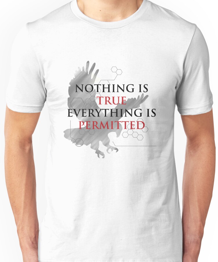 Nothing is True, Everything is Permitted Unisex T-Shirt NOW $22.75 October 13, 2017 by admin Click Here to Purchase at: $22.75 from the Artist: Unisex T-Shirt. A quote from the popular Assassins Creed series.
