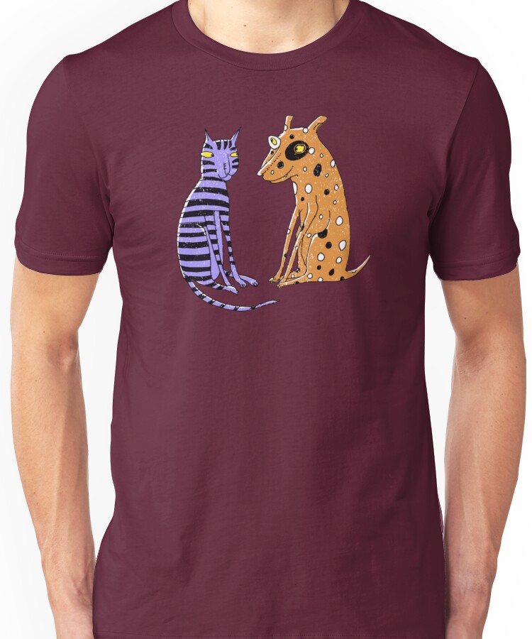 from the Artist: Unisex T-Shirt. Based on true story!!! My sister and brother-in-law had a cat and dog who were very attached to each other. My brother-in-law claimed that their rude goings-on caused him to lose his appetite while eating his dinner, but his girth would not seem to support that story… Edit: I would just like to say, to clarify the record for anyone who may be reading this that my brother-in-law is much, much slimmer than many people. The card version of this has a red heart in the background. Lots more critters in the Birds and Beasts section: http://www.redbubble.com/people/susansanford/collections/331874-birds-and-beasts