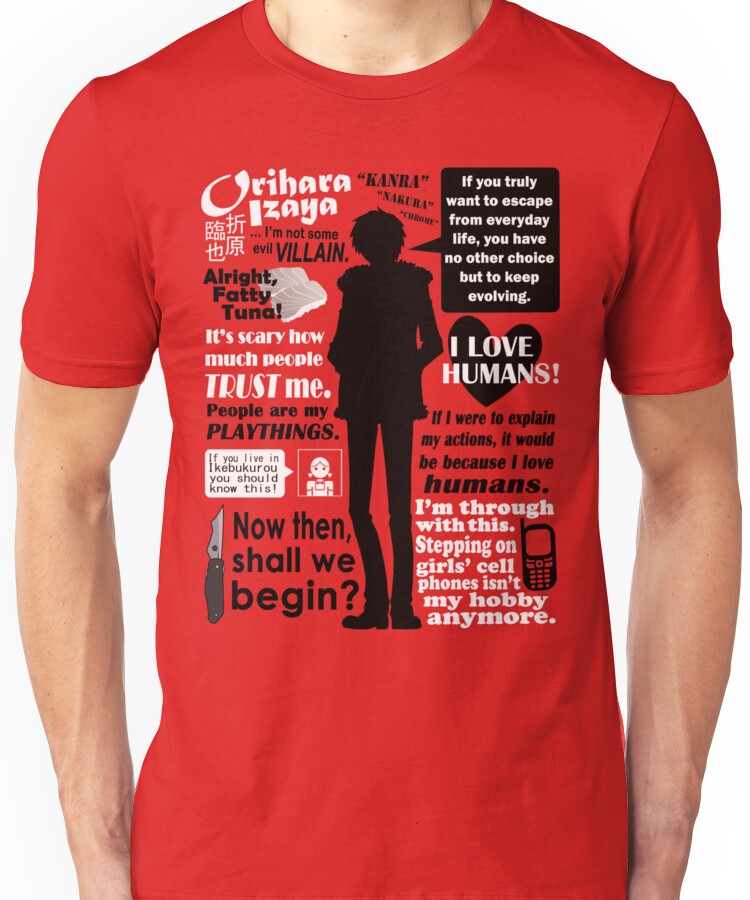 Orihara Izaya Quotes Unisex T-Shirt NOW $19.5 October 13, 2017 by admin Click Here to Purchase at: $19.5 from the Artist: Unisex T-Shirt.
