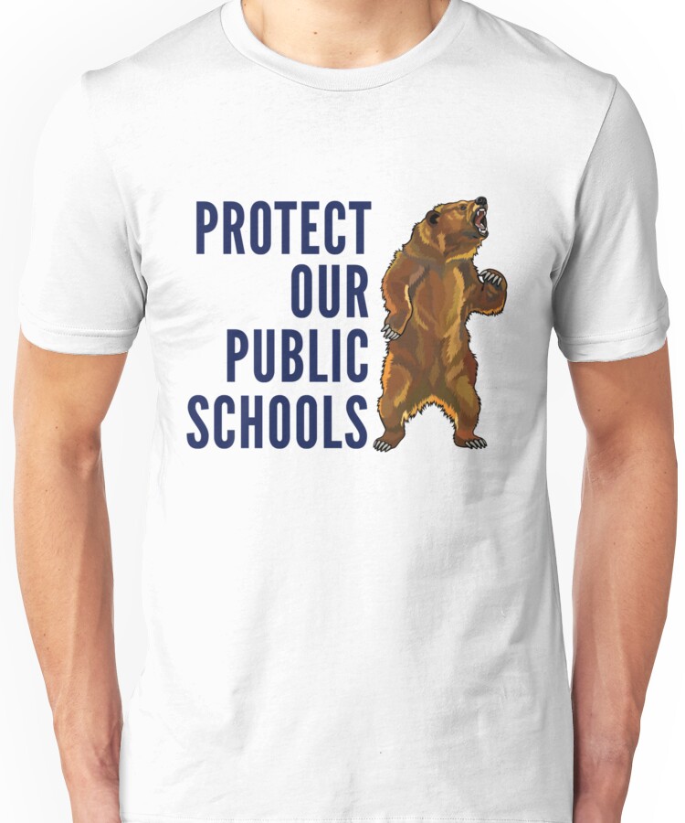 from the Artist: Unisex T-Shirt. Some might say you need guns in schools to protect yourselves from threats — like grizzly bears! But we have to ask: Who will protect K-12 public schools from Washington’s new elite?