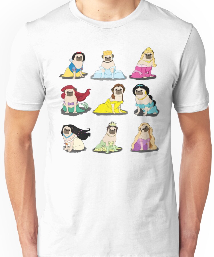 from the Artist: Unisex T-Shirt. A new version of the Pug Princesses, this time without the writing underneath each one! If you would like a version featuring certain pug princesses, please message me on redbubble and I will be more then happy to do that for you 🙂