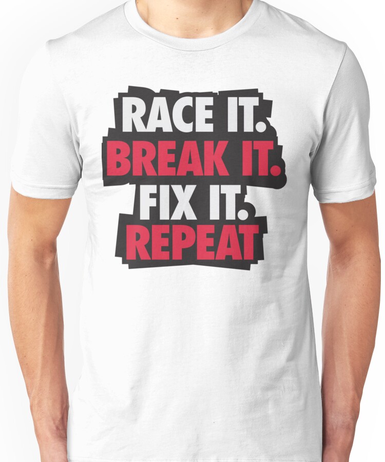 Race it. Break it. Fix it. REPEAT Unisex T-Shirt NOW $22.91 October 13, 2017 by admin Click Here to Purchase at: $22.91 from the Artist: Unisex T-Shirt. Race it. Break it. Fix it. REPEAT