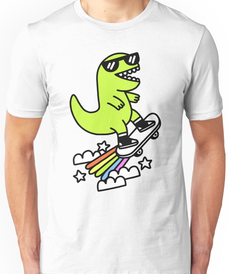 from the Artist: Unisex T-Shirt. super cool t-rex riding a super sweet skateboard ride through the sky