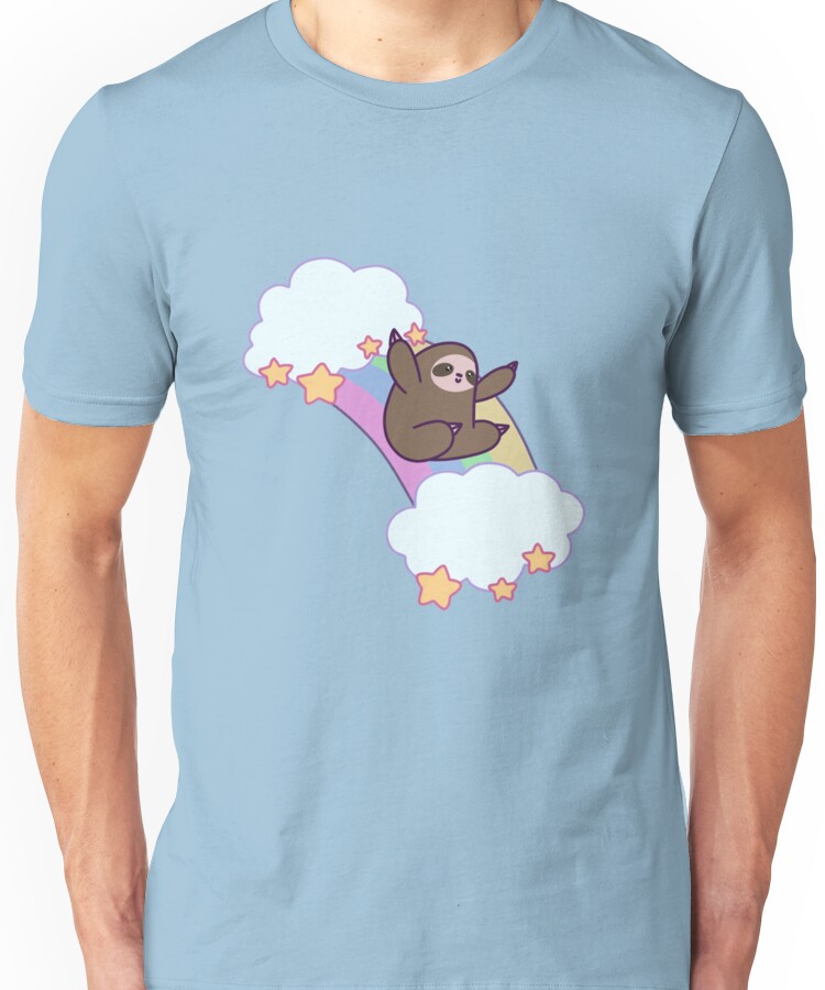 from the Artist: Unisex T-Shirt. A cute, simple design of a kawaii, cartoon sloth, sliding down a pastel colored rainbow, connected with two fluffy white clouds, with yellow stars on them. Great as a sticker, t-shirt, pillow, phone case, and bag. Perfect for those who love rainbows, clouds, stars, sky themes, adorable animals, sloths or anything kawaii.