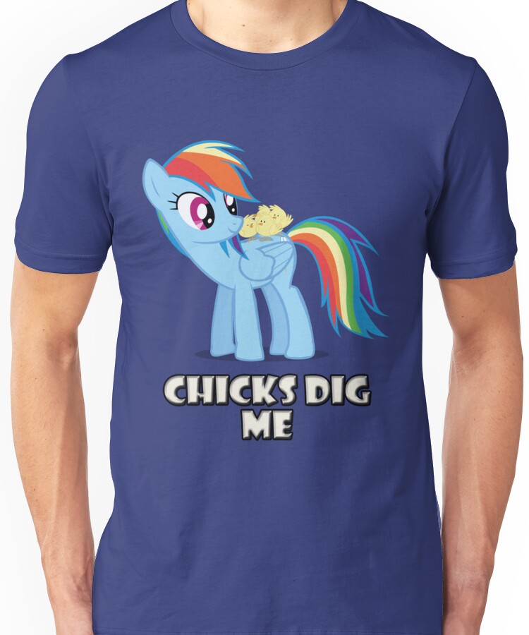 from the Artist: Unisex T-Shirt. Rainbow Dash likes chicks, and chicks like Rainbow Dash, they’re very close. This version has stylized text. If you’re looking for the textless version you can find it here: http://www.redbubble.com/people/vigorousjammer/t-shirts/7879731-rainbow-dash-chicks-textless-ver If you’re looking for a version with more basic text, you can find it here: http://www.redbubble.com/people/vigorousjammer/works/10232436-rainbow-dash-chicks-alternate-ver