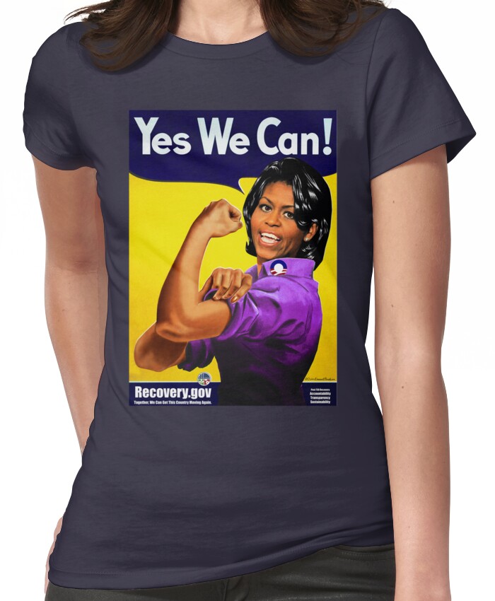 from the Artist: Women’s T-Shirt. Based on Rosie the Riveter, a cultural icon of the United States, representing the American women who worked in war factories during World War II, many of whom worked in the manufacturing plants that produced munitions and materiel. These women took new jobs and sometimes the places of the male workers who were in the military. The character is now considered a feminist icon in the US, and a herald of women’s economic power to come. Rosie went on to become perhaps the most widely recognized icon of that era. The films and posters she appeared in were used to encourage women to go to work in support of the war effort. On January 12, 2009 Shirley Karp (who was the original Rosie during 1939-1941) passed away. Until her death, she was the oldest living Rosie the Riveter model. We Can Do It, Yes We Can! I created this work in support of Barack Obama’s fight for affordable health care, affordable higher education, energy independence, prosperity and peace.