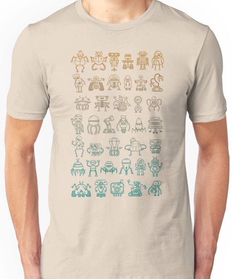 from the Artist: Unisex T-Shirt. Robot Butts. Rows of Robots, some are cheeky, some are not. Subtle on some colours. For *Men, Women* and *Kiddie Winks* on *T-shirts* (Men and Ladies, V-neck, Long Sleeve), *Hoodies* and *Kiddie Clothes!* _Like/Follow me_ for new T-shirt and Art updates, if you please: !http://img138.imageshack.us/img138/8136/facebook32k.png!:http://www.facebook.com/HeavyhandDesigns !http://img692.imageshack.us/img692/624/twitter32p.png!:https://twitter.com/#!/Heavyhand76 *You may also like* !http://img94.imageshack.us/img94/5641/spacedbunnytshirtclip.jpg!:http://www.redbubble.com/people/heavyhand/t-shirts/4010221-1-spaced-funny-bunny-whotsit !http://img220.imageshack.us/img220/691/skullmeupclip.jpg!:http://www.redbubble.com/people/heavyhand/t-shirts/3354438-1-skull-me-up *Detail* !http://img263.imageshack.us/img263/8572/robuttsdetail2.jpg! Artists impression. Mock up for indicative purposes only.