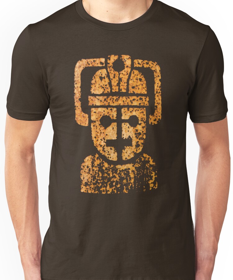 from the Artist: Unisex T-Shirt. Based on one of the most “popular card designs”:http://bdcthomas.com/node/111 at my photography site, the original graphic for this derives from emblem used by the serial villians, the Cybermen, in the BBC television series Doctor Who. The photograph this print is based on was taken in Brighton of a piece of graffiti on one of the remains support posts for the ruined West Pier, hence the not-so-invincible rust. Also available as a “small chest logo”:http://www.redbubble.com/people/benthos/t-shirts/6607415-1-rusty-the-cyberman-small-chest-emblem. Now available in “Lego”:http://www.redbubble.com/people/benthos/t-shirts/6821944-2-lego-minifig-cyberman.