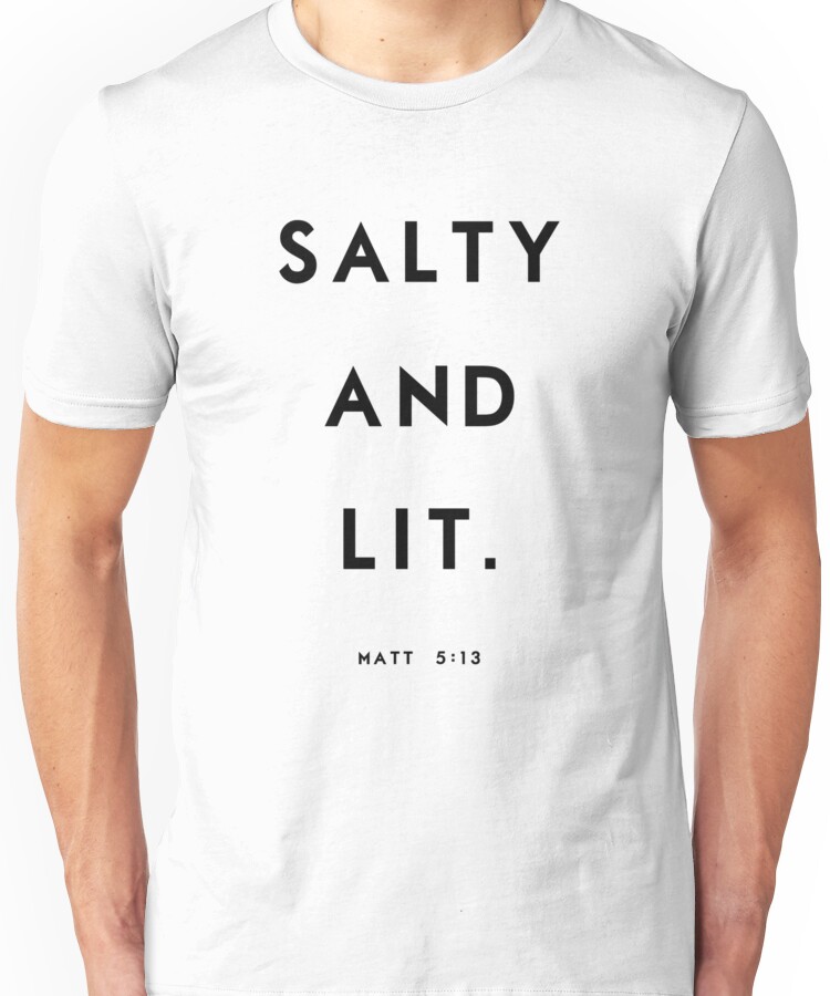 from the Artist: Unisex T-Shirt. “”You are the salt of the earth. But if the salt loses its saltiness, how can it be made salty again? It is no longer good for anything, except to be thrown out and trampled underfoot. You are the light of the world. A town built on a hill cannot be hidden.” Matthew 5:13-14
