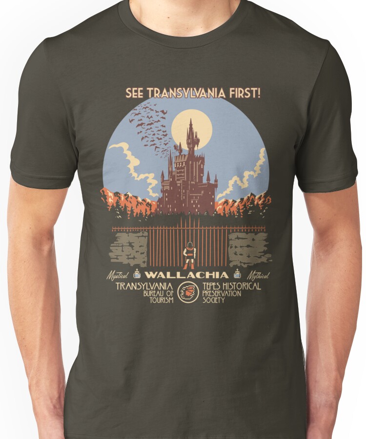 from the Artist: Unisex T-Shirt. Wallachia or Walachia is a historical and geographical region of Transylvania. It is situated north of the Danube and south of the Southern Carpathians. Wallachia is sometimes referred to as Muntenia (Greater Wallachia), through identification with the larger of its two traditional sections; the smaller being Oltenia (Lesser Wallachia). It is known as being the home of Castlevania, the ancestral castle of Count Vlad Dracula, and for having laws preventing the Belmont family from visiting the country, even during vacation months.