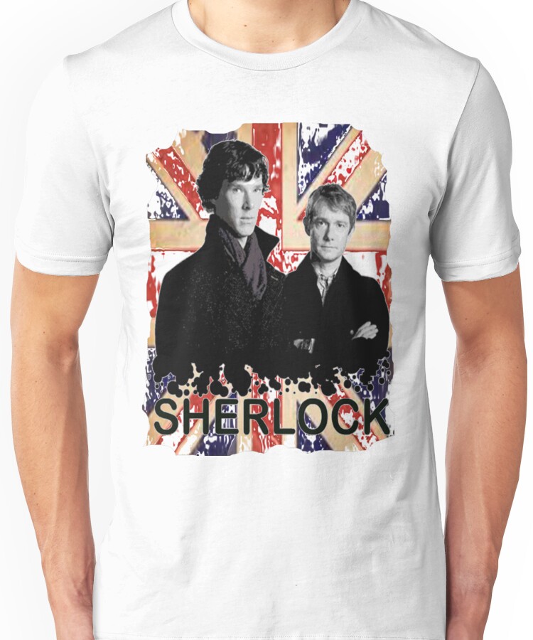 from the Artist: Unisex T-Shirt. The two characters of the BBC show Sherlock, with British flag background. BBC Sherlock © BBC, Steven Moffat and Mark Gatiss.