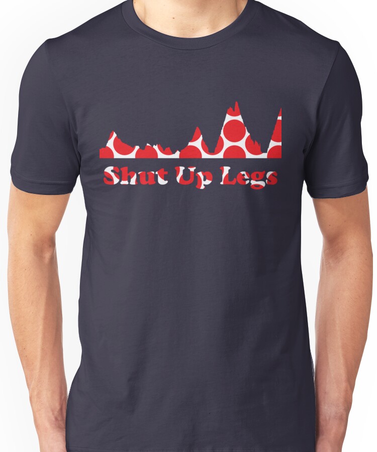 from the Artist: Unisex T-Shirt. Red Polka Dot Mountain Profile with Jens Voigt’s famous quote “Shut Up Legs”
