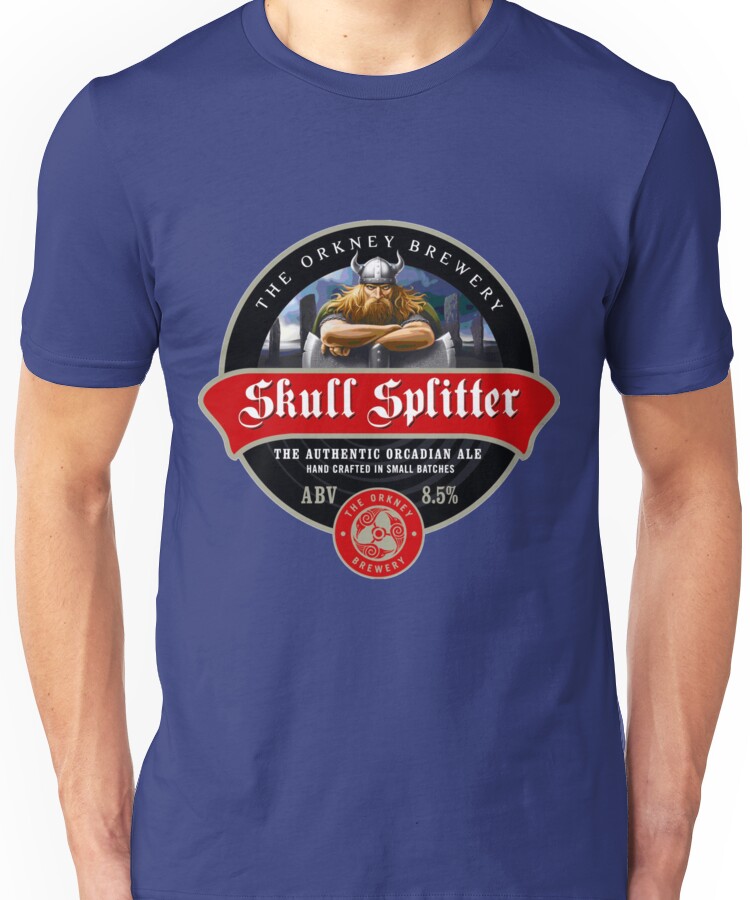 from the Artist: Unisex T-Shirt. Skull Splitter is our strongest ale: which is named after Thorfinn Einarsson who was the 7th Viking Earl of Orkney. Sophisticated, satiny smooth with a deceptively light character, it is a tribute to our colourful forbear. On the nose, this strong beer has a fruity malt character, with hints of dark fruit, spicy hop, dates and figs. On the palate, rich and complex with sweet toasted malt, molasses, fresh and dried fruit and hints of warming spices.