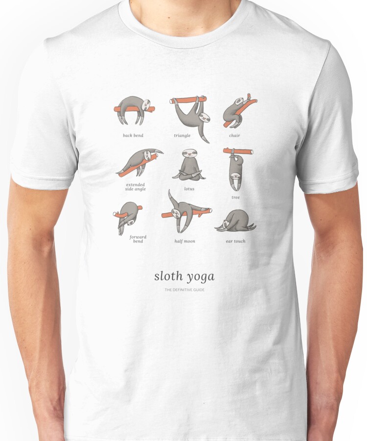 from the Artist: Unisex T-Shirt. It struck me one day during yoga class that sloths would probably be great at it. After all, they are super chill, they move fluidly, and they often find themselves in awkward positions. With all this in mind, I present you you The Definitive Guide to Sloth Yoga.