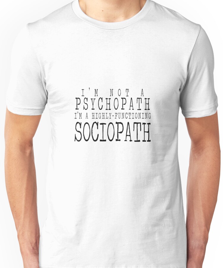 from the Artist: Unisex T-Shirt. Inspired by the BBC’s Sherlock “I’m not a psychopath Anderson, I’m a highly-functioning sociopath, do your research.”