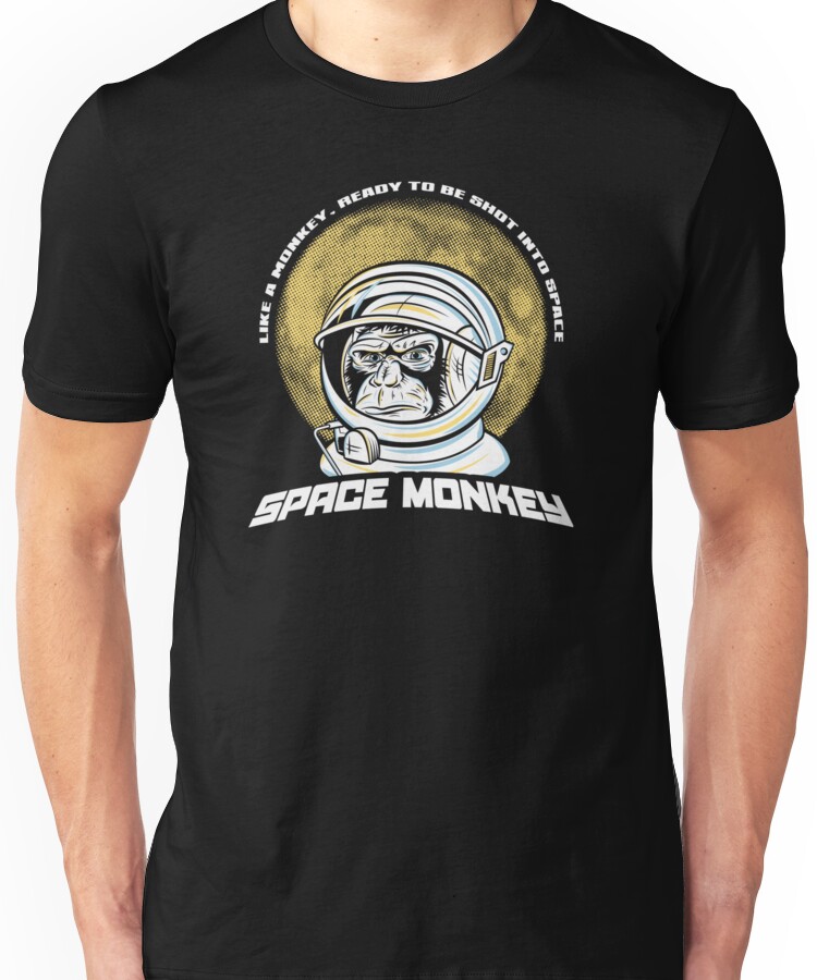 Space Monkey Unisex T-Shirt NOW $21.13 October 13, 2017 by admin Click Here to Purchase at: $21.13 from the Artist: Unisex T-Shirt. Like a monkey, ready to be shot into space!