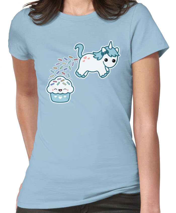 from the Artist: Women’s T-Shirt. Super cute baby unicorn pooping out rainbow sprinkles on happy cupcake friend after dying his hair blue.