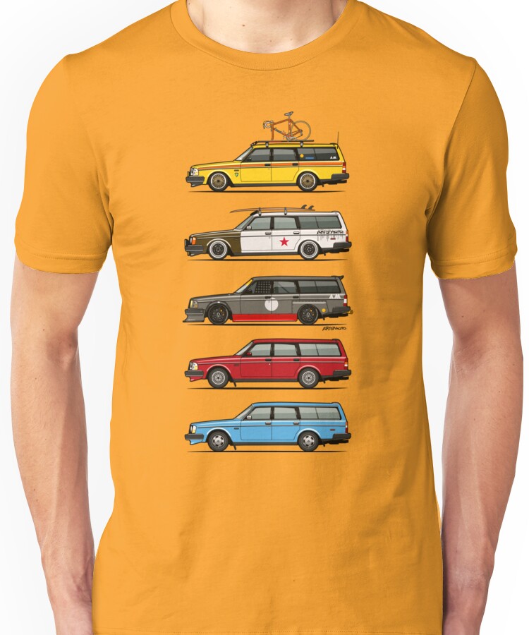 from the Artist: Unisex T-Shirt. For fans of the swedish brick. Side view of Volvo 245 Wagons, stock blue, red, track car, lemon racer, Volvofornia surf rat rod, yellow with rack roof and bike, ©2015 All Rights Reserved