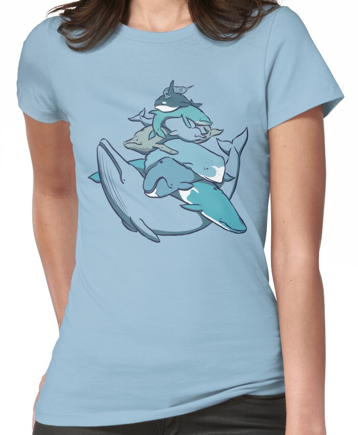 from the Artist: Women’s T-Shirt. narwhal, killer, minke, baird’s beaked, humpback, sperm, bowhead and fin put their weight on blue 🙂