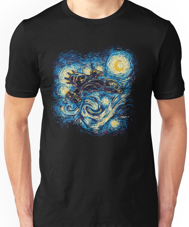 Starry Flight Unisex T-Shirt NOW $19.5 October 13, 2017 by admin Click Here to Purchase at: $19.5 from the Artist: Unisex T-Shirt. Serenity / Firefly mixed with Van Gogh’s Starry Night