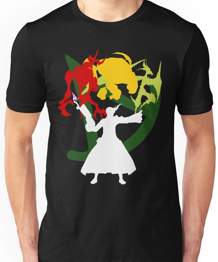 from the Artist: Unisex T-Shirt. A white silhouette of a summoner from FFXIV in the level 50 AF gear with the Veil of Wiyu. Behind them are silhouettes of the Ifrit, Titan and Garuda Egis with the SMN icon. Works best on darker background colours. On my profile is also a black silhouette version which works better on lighter backgrounds, as well as a sticker sheet with each piece of this image as an individual sticker.