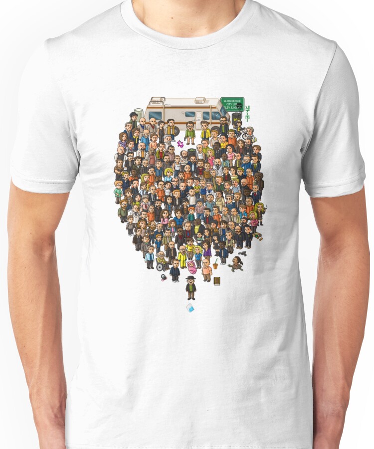 from the Artist: Unisex T-Shirt. An updated version now featuring 143 characters. Can you name them all? 1. Walter White 2. Heisenberg 3. Mr. Lambert 4. Mr. White 5. Jesse Pinkman 6. Jesse Pinkman 2 7. Skyler White 8. Walter White Jr. 9. Hank Schrader 10. Marie Schrader 11. Saul Goodman 12. Gus Fring 13. Mike Ehrmantraut 14. Steven Gomez 15. Badger 16. Skinny Pete 17. Combo 18. Tuco Salamanca 19. Hector Salamanca 20. The Cousins 21. Jane Margolis 22. Ted Beneke 23. Victor 24. Gale Boetticher 25. Lydia Rodarte-Quayle 26. Todd 27. Bogdan Wolynetz 28. Krazy 8 29. Wendy 30. Mr. Pinkman 31. Mrs. Pinkman 32. Gretchen Schwartz 33. Dr. Delcavoli 34. Donald Margolis 35. Tim Roberts 36. ASAC Merkert 37. SAC Ramey 38. Clovis 39. Holly White 40. Group Leader 41. Kaylee Ehrmantraut 42. Old Joe 43. Andrea Cantillo 44. Brock Cantillo 45. Huell 46. Kuby 47. Tyrus Kitt 48. Dennis Markowski 49. Declan 50. Chad 51. Carmen