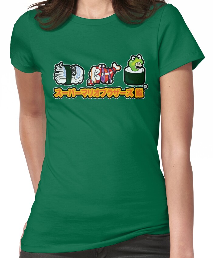 from the Artist: Women’s T-Shirt. !http://farm4.static.flickr.com/3019/3070860122_5e01863ce2.jpg?v=0! !http://www.thickblackoutline.com/mgbies2.jpg!:http://magoombie.blogspot.com/2009/02/super-mario-bros-tshirt.html *Featuring:* Blooper Nigiri – ???? ???? Big Bertha & Baby Cheeps Sashimi – ???? ?? Frogsuit Mario Maki – ??? ??? ???? Japanese translates to: “Super Mario Brothers Sushi” Alternative Original Nigiri: !http://www.thickblackoutline.com/marionigiri.jpg! low quality puke for a reason kids! 😉