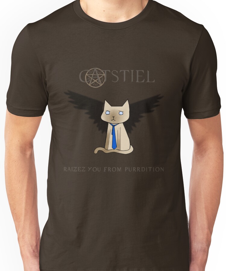 from the Artist: Unisex T-Shirt. Here is Catstiel from Supercatural. “”Im the cat who gripped you tight and raized you from purrdition.” I know you didn’t have too many choices when changing the background color with the old version, so I’ve decided to upload this improved one. Now you can have it in any color you like and it won’t affect the design. Also the sticker version is not so empty now. Enjoy! <3