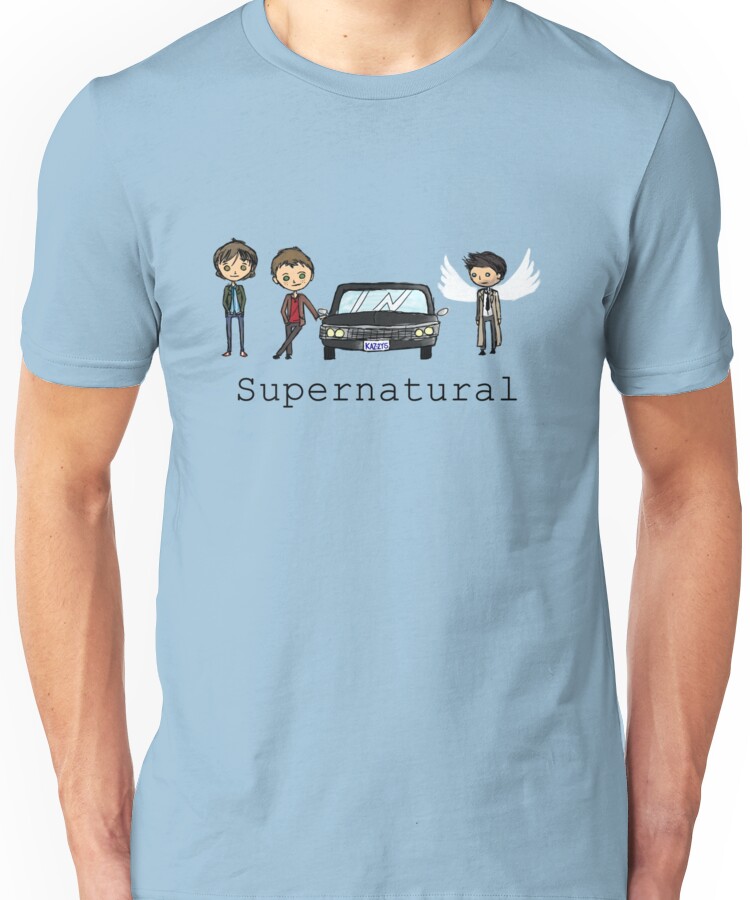 from the Artist: Unisex T-Shirt. Sam, Dean, the ever-important Impala, and Castiel, all lined up ready to fight some baddies and look adorable while doing it. Supernatural and it’s Characters (c) Eric Kripke and Probably the CW