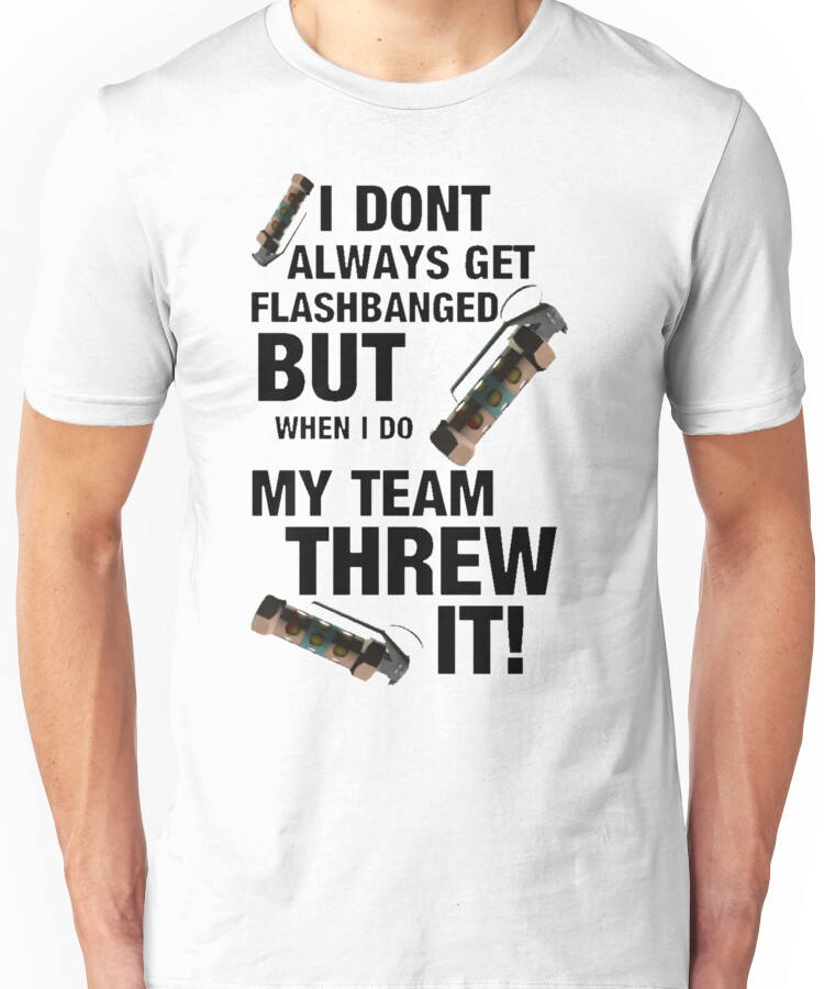 from the Artist: Unisex T-Shirt. Influences from the popular FPS game; Counter-strike, the standard team flashbang that always takes you by surprise just as you rush on to bomb site that causes your death and a spew of rage toward the moron who didn’t warn you.