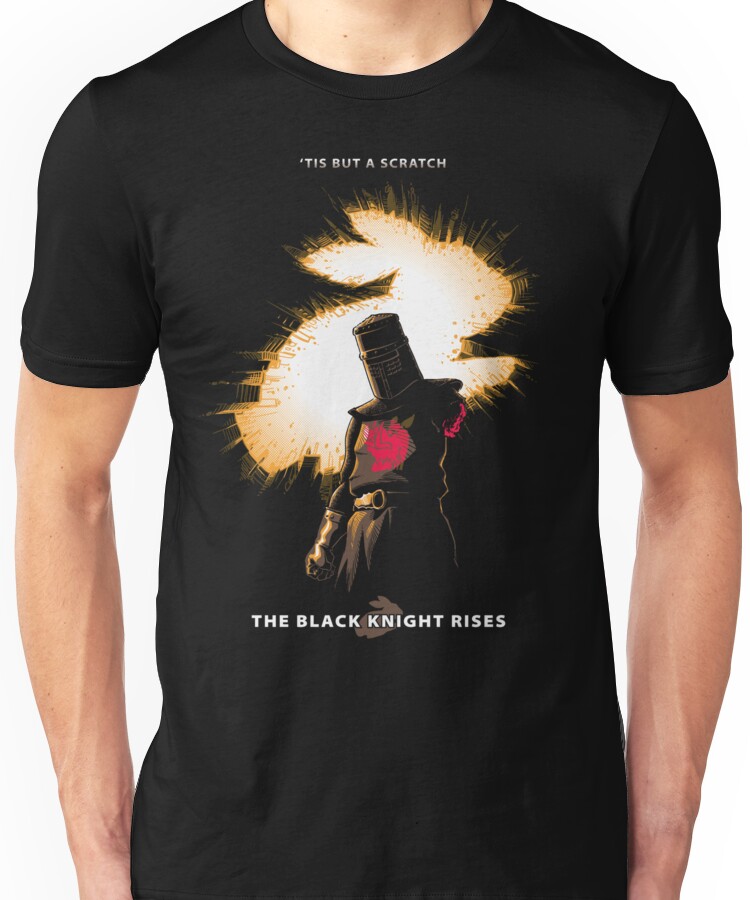 from the Artist: Unisex T-Shirt. ‘Tis but a bat scratch! And now with the poster text. “Click for the original textless version!”:http://www.redbubble.com/people/obvian/works/9171227-the-black-knight-rises And also “click for the poster version”:http://www.redbubble.com/people/obvian/works/9174205-the-black-knight-rises .