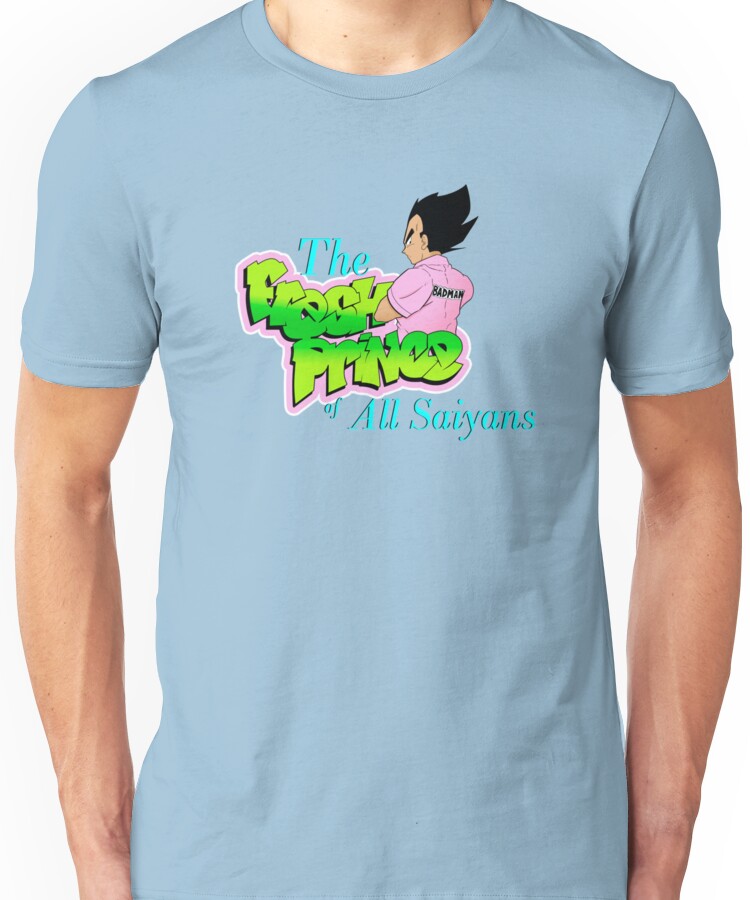 from the Artist: Unisex T-Shirt. Vegeta the Fresh Prince of All Saiyans. The Baddest man in the Planet. ** This design is a self-created parody. All names, characters, likenesses and incidents portrayed in this production are fictitious. Any identification with actual persons, places, buildings, and products is completely coincidental and should not be inferred.