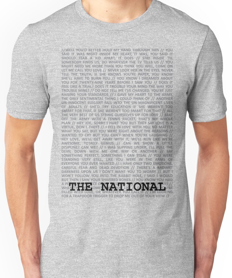 The National Typography Unisex T-Shirt NOW $19.5 October 13, 2017 by admin Click Here to Purchase at: $19.5 from the Artist: Unisex T-Shirt. lyrics from assorted songs by The National
