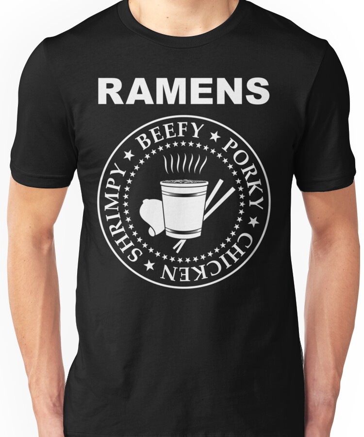 from the Artist: Unisex T-Shirt. all white print, hey ho let’s go “also available on a light tee”:http://www.redbubble.com/people/swissarmyshark/t-shirts/5819425-1-the-ramens !http://ih3.redbubble.net/work.5819425.1.fig,silver,mens,fbfbfb.the-ramens-v3.jpg!