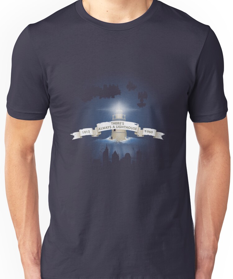 from the Artist: Unisex T-Shirt. Inspired by the quote: “There’s always a lighthouse. There’s always a man, there’s always a city…” Show your love for the Bioshock series with this special design, featuring both Columbia and Rapture.