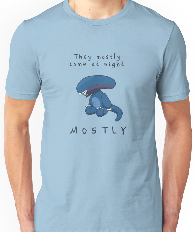 from the Artist: Unisex T-Shirt. “We’d better get back, ’cause it’ll be dark soon, and they mostly come at night… Mostly.” – Newt, Aliens For the geeks in training but adult sizes are also available.