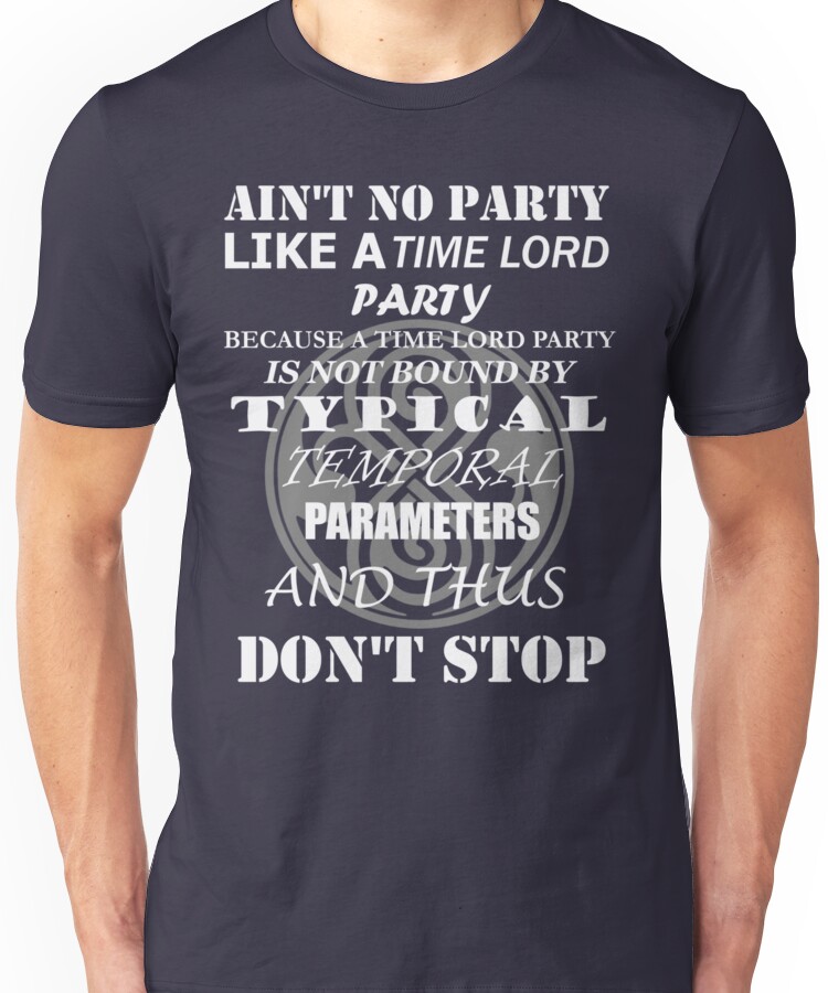 from the Artist: Unisex T-Shirt. “Ain’t no party like a Time Lord party because a time lord party is not bound by typical temporal parameters and thus don’t stop!” Truer words have never been said. Wear this shirt proudly to signify that time is not the boss of you!