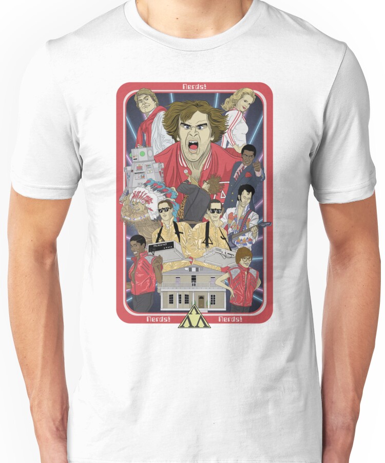 from the Artist: Unisex T-Shirt. This one is called “Tri Lamb Talent!” and it’s a poster I drew for the film, that I love, Revenge of the Nerds. Loved this film as a kid and still love it as a semi-adult Nerd. I hope i did it justice, even drawing Lamar made me LOL so hard. I wanted to make it as 80’s as possible and even managed to mimic the background off of those cheesy laser class photos.