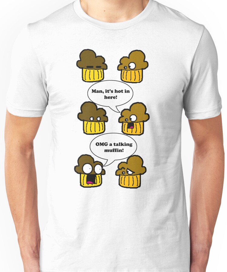 from the Artist: Unisex T-Shirt. Two muffins were in an oven. The first one said, “Man, it’s hot in here!” The second one said, “OMG a talking muffin!” Possibly one of my favorite jokes ever, so I put it on a tee 🙂 Hit 1,000 views 3/30/2011 😀 !http://i47.tinypic.com/swwbk2.jpg!