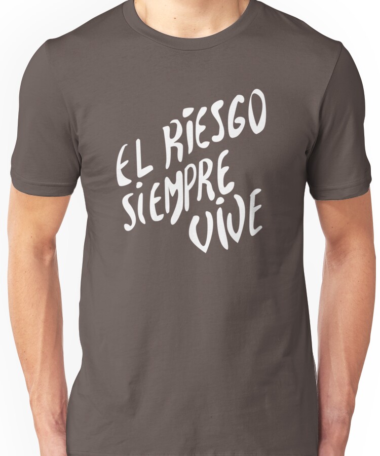 from the Artist: Unisex T-Shirt. “El Riesgo Siempre Vive.” is written on Vasquez’s chest plate armor. In Spanish, this literally means “the risk lives forever”, and figuratively means (it’s a saying) that taking risks is necessary to survive.