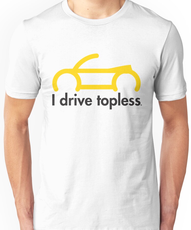 from the Artist: Unisex T-Shirt. Simplified side view of a yellow VW convertible with the top down, with “I drive topless”