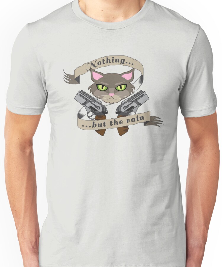 from the Artist: Unisex T-Shirt. “What do you hear, Starbuck?” “Nothing but the rain.” “Grab your gun and bring in the cat.” BSG fans, here’s a present from me to you, based on subtle yet memorable quote from the series. Plus it has a cat AND guns, what more can you ask for?