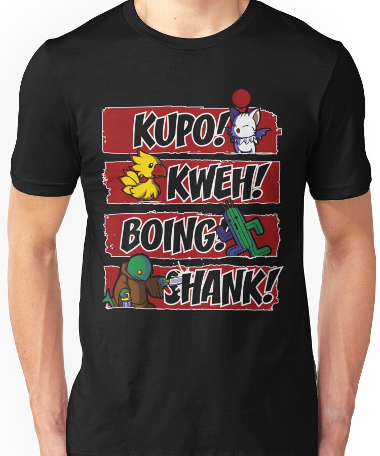 from the Artist: Unisex T-Shirt. Four of the most reoccurring creatures in the Final Fantasy series. They’re cuddly, cute, a little prickly, and sometimes a bit stabby.