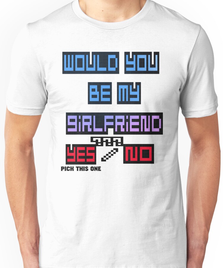 would you be my girlfriend yes or no? Unisex T-Shirt NOW $19.5 October 13, 2017 by admin Click Here to Purchase at: $19.5 from the Artist: Unisex T-Shirt. would you be my girlfriend?