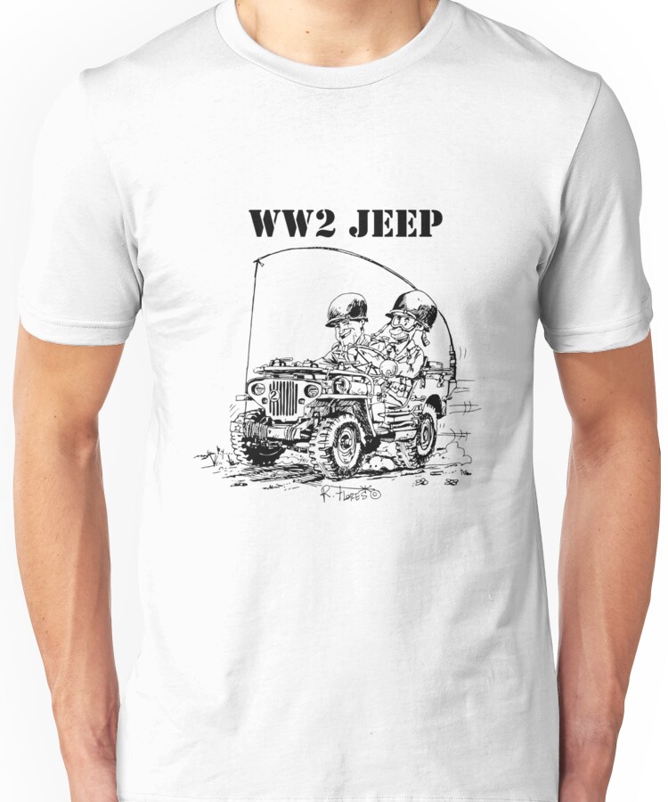 from the Artist: Unisex T-Shirt. Balck and white drawing of a WW2 jeep, Willys MB or Ford GPW (also known as G503), with two US GIs.