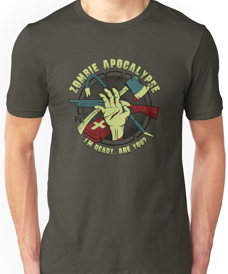 from the Artist: Unisex T-Shirt. Zombie Apocalypse – I’m ready. Are you? If you want to join me on facebook, tumblr or twitter you can do so by clicking on the relevant icons. I can’t promise anything other than inane babble and endless t-shirt links but what else would you expect? JOIN ME! “!http://farm6.static.flickr.com/5306/5615628843_03d27f563c_t.jpg!”:http://www.facebook.com/pages/RobotrobotROBOT/192286944140995 “!http://farm6.static.flickr.com/5102/5615628871_d9c9134c61_t.jpg!”:http://robotrobotrobot.tumblr.com/ “!http://farm6.static.flickr.com/5263/5615630677_d061104bb1_t.jpg!”:http://twitter.com/robotrobotROBOT