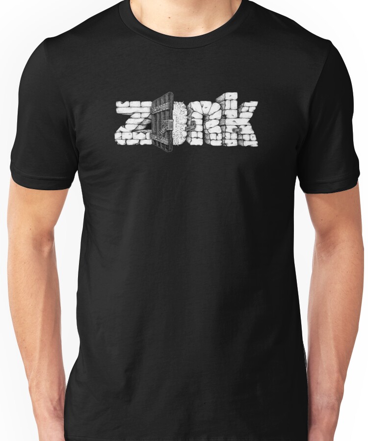 from the Artist: Unisex T-Shirt. West of House You are standing in an open field west of a white house, with a boarded front door. There is a small mailbox here. look West of House You are standing in an open field west of a white house, with a boarded front door. There is a small mailbox here. examine house The house is a beautiful colonial house which is painted white. It is clear that the owners must have been extremely wealthy. open mailbox Opening the small mailbox reveals a leaflet. read leaflet (Taken) “WELCOME TO ZORK! ZORK is a game of adventure, danger, and low cunning. In it you will explore some of the most amazing territory ever seen by mortals. No computer should be without one!”